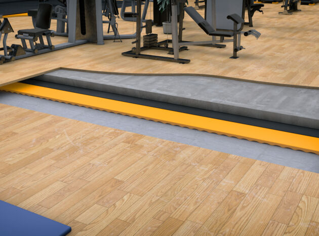 Mit g-fit Cardio wird ein High-Tech- Werkstoff im Boden verlegt und dieser dadurch elastisch gelagert. Lärm wird nachhaltig reduziert.