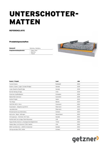 Mit dem Einbau von Getzner Unterschottermatten erreichen Sie ein hohes Maß an Fahrbahn-Elastizität. Erschütterungen und Körperschall werden wirksam reduziert und der Schotter geschont – mehr noch: Unterschottermatten sind leicht zu handhaben, schnell zu verlegen und können mit schwerem Baustellengerät befahren werden.