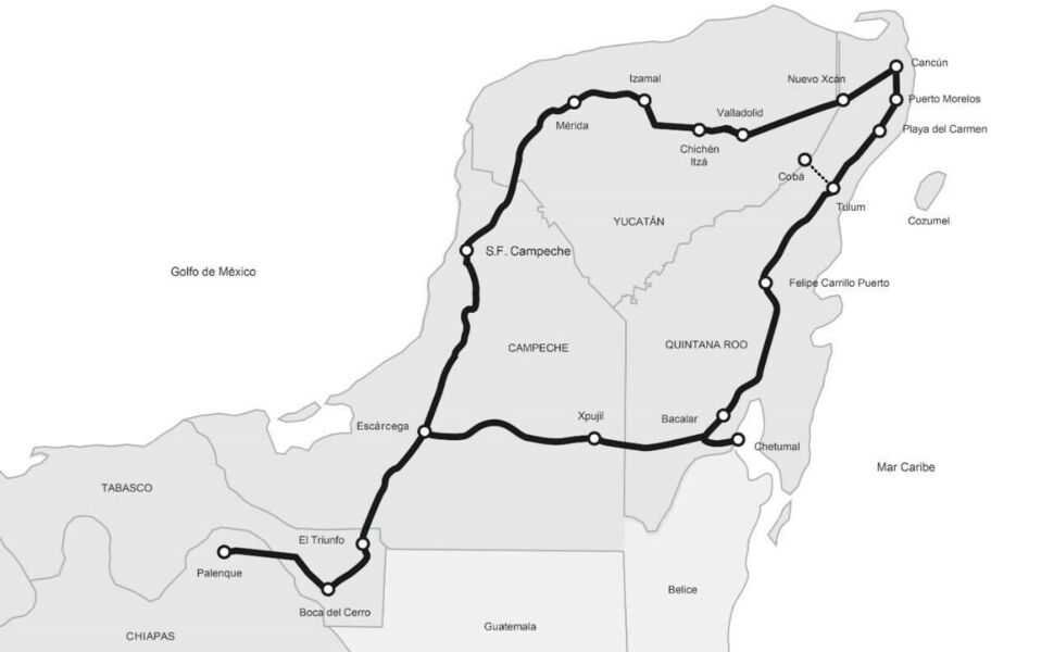 The Tren Maya line will run from the city of Palenque in the state of Chiapas in south-eastern Mexico to the tourist resort of Cancún in Quintana Roo via two different routes. The western route leads through the state and city of Campeche and Yucatán to Cancún, while the eastern branch will follow various Mayan sites, cities and beaches. Most of the route already exists and will be upgraded, while around 40 percent will be newly built.