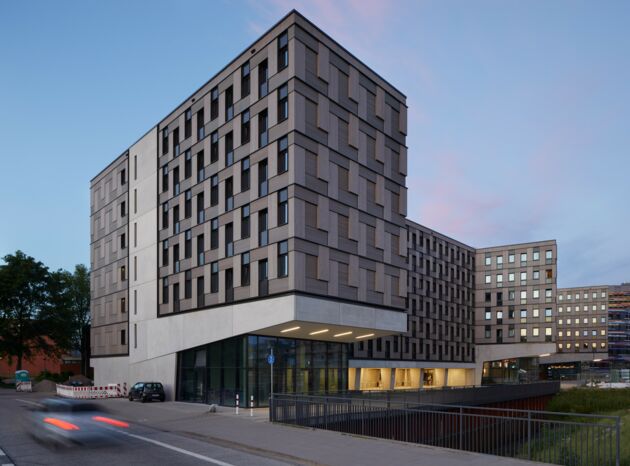 Nel quartiere Wilhelmsburg di Amburgo sono disposti su sei piani e lunghi 100 metri 371 appartamenti per studenti in legno massiccio: “Woodie” è la casa dello studente in legno più grande d’Europa e la casa in legno più alta di Amburgo.