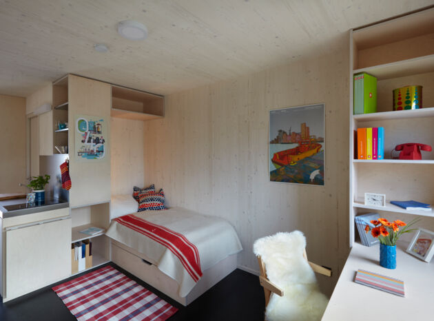 Ispirato alle pile di container del porto di Amburgo, “Woodie” è composto da moduli prefabbricati in legno, impilati uno sopra l’altro. Tutta la struttura poggia su un basamento in cemento armato. Gli appartamenti di 20 m² sono già completamente arredati, con letto, bagno, armadio a muro, angolo cottura e tavolo pieghevole. Se necessario, i singoli moduli possono anche essere combinati per formare unità abitative più grandi. Un efficace isolamento acustico è fondamentale in tale progetto. Ecco perché Getzner è stato coinvolto in qualità di esperto da Kaufmann Bausysteme GmbH.