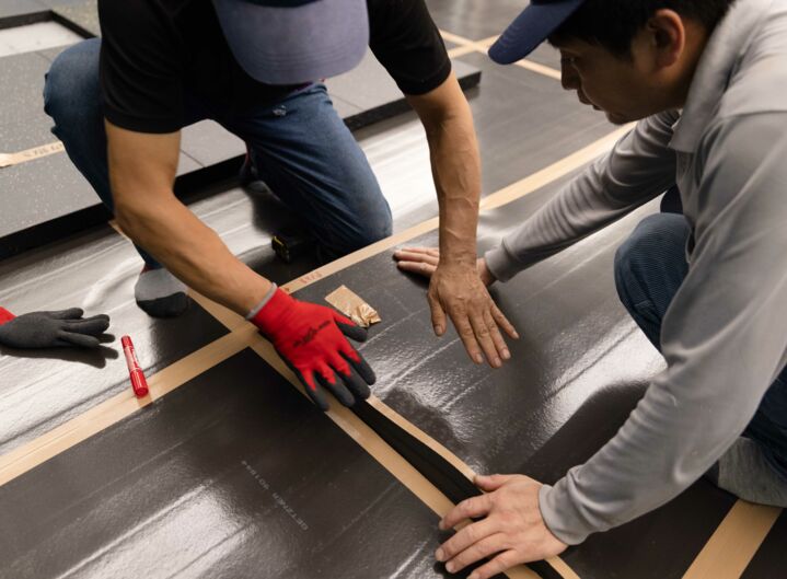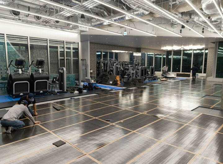 トレッドミル、レッグプレス、ダンベルなどの振動が発生してしまう機器を使用すると、大きな振動とそれによって音が伝達され、下階に影響を及ぼしていました。当初から防振・防音施工は行っており性能値には満足していました。しかしながら下階フロアに対し更に騒音を低減したいとの要望を受け、防振を強化する必要がありました。予定されていたオープンのわずか数週間前に、フィットネスからの騒音と振動を確実に遮断するために、特に効果的で後付け可能なソリューションを見つける必要がありました。